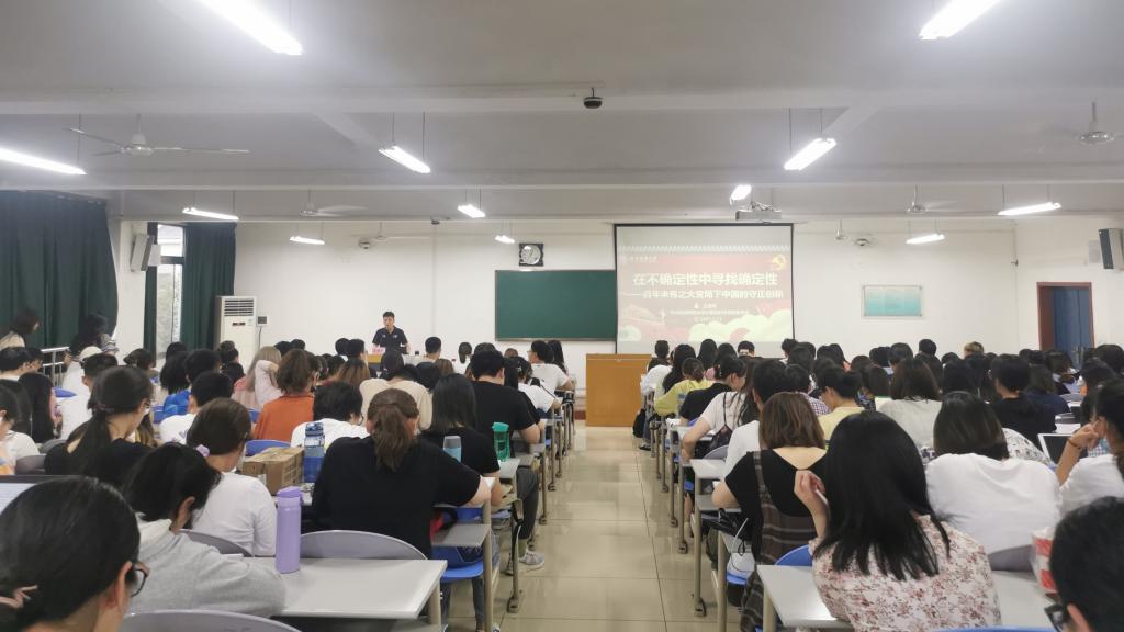 党委书记王耀明以“百年未有之大变局下中国的守正创新”为题,在文津楼1519教室为我校第六期发展对象培训班的200余名学员上了一堂主题鲜明、内容丰富的党课。党课由学院党委组织员郭康凌主持。